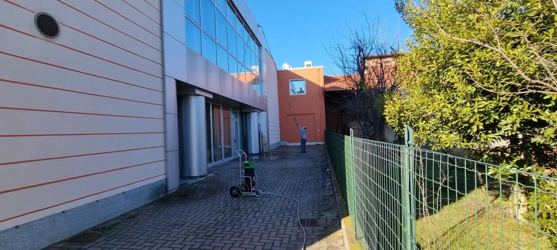 Interventi mirati di pulizia profonda esterna degli immobili vetrate alte, infissi - Rimozione di patine biologiche, muschi e licheni da autobloccanti, muri e vialetti.